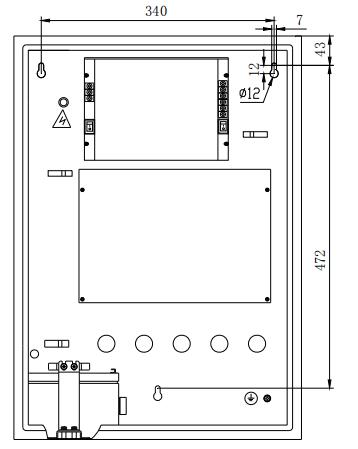 氣體滅火控制器采用壁掛式安裝,安裝尺寸如圖5-8所示。用3個M6的膨脹螺栓將GST-QKP04固定在牢固的墻壁上,膨脹螺栓的水平間距為340mm,高度相距472mm。